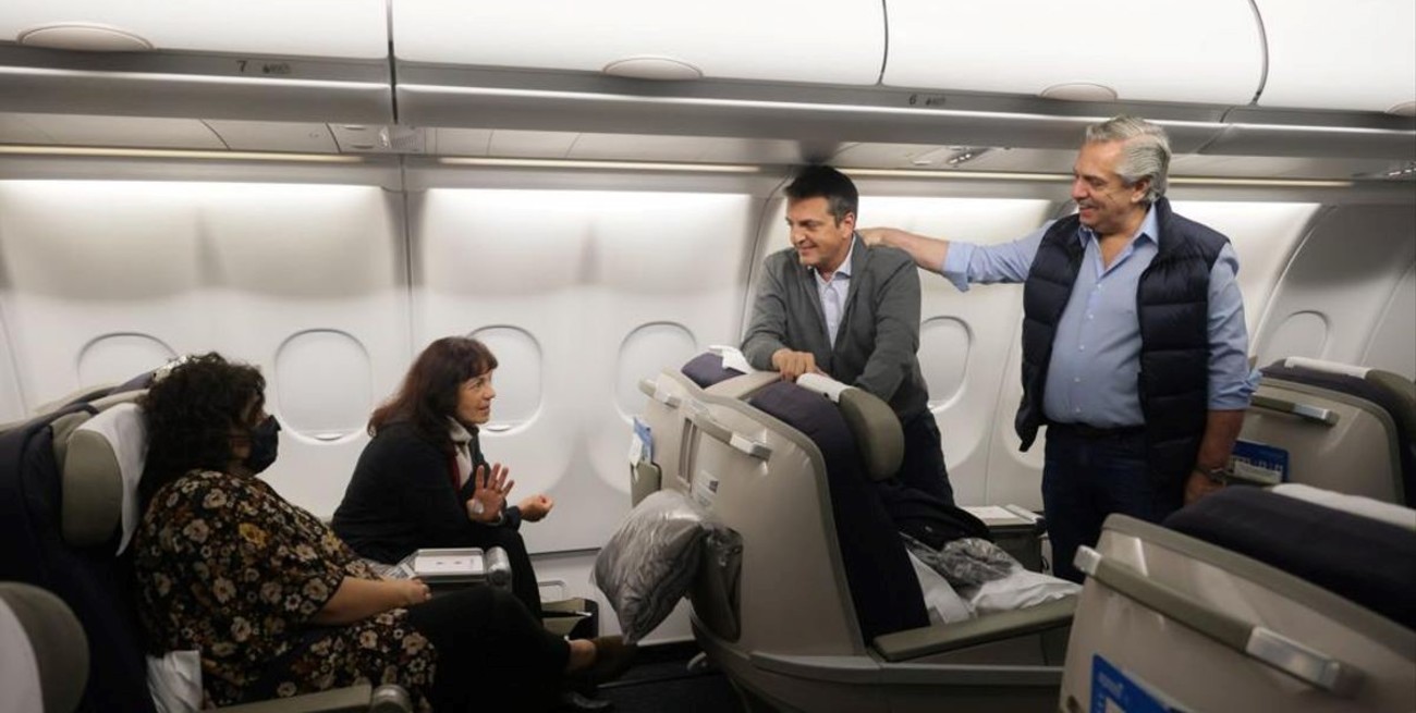 El vuelo de Aerolíneas Argentinas despegó a las 23:34 desde Ezeiza. Lo acompañan Fabiola Yáñez, Santiago Cafiero, Vizzotti y Massa.