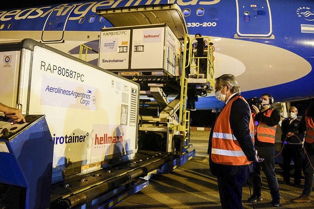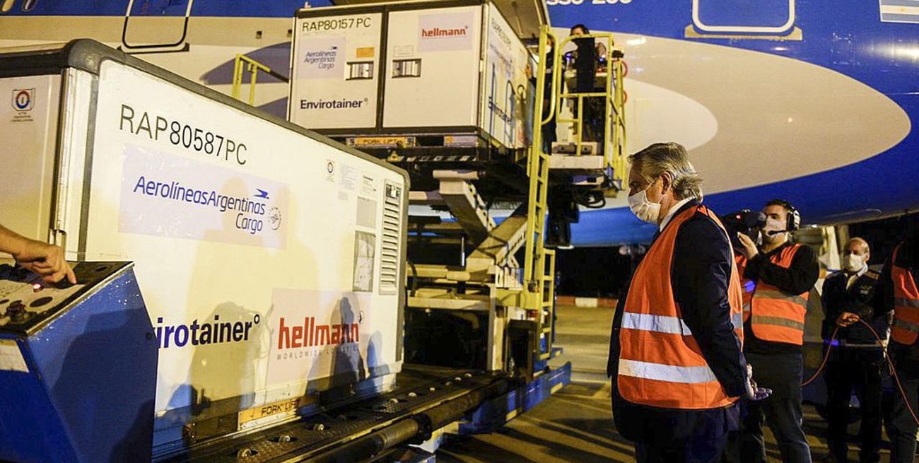 En la recepción del avión, Fernández estuvo acompañado por el jefe de Gabinete, Santiago Cafiero, la ministra de Salud, Carla Vizzotti, y el titular de Aerolíneas Argentinas, Pablo Ceriani, entre otras autoridades.