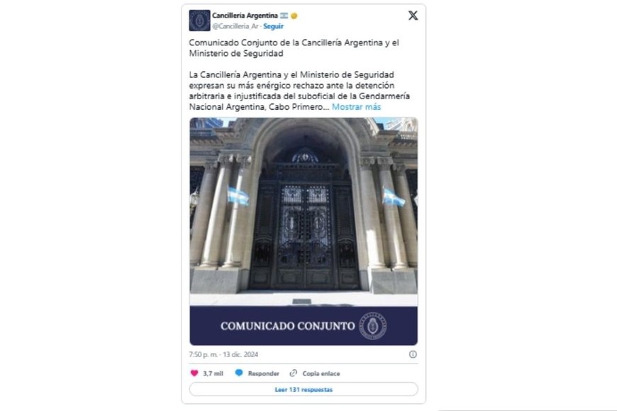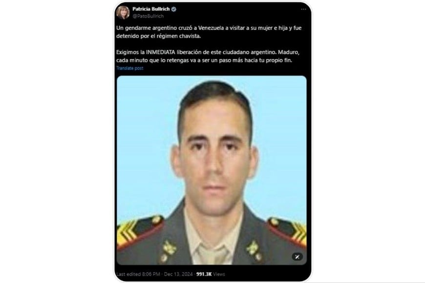 “Argentina actuará con toda firmeza en todas las instancias y ante todos los organismos internacionales para exigir la inmediata liberación del suboficial detenido”, enfatiza el comunicado. Por su parte, la ministra de Seguridad, Patricia Bullrich, advirtió: “Maduro, cada minuto que lo retengas va a ser un paso más hacia tu propio fin”.