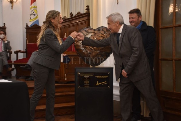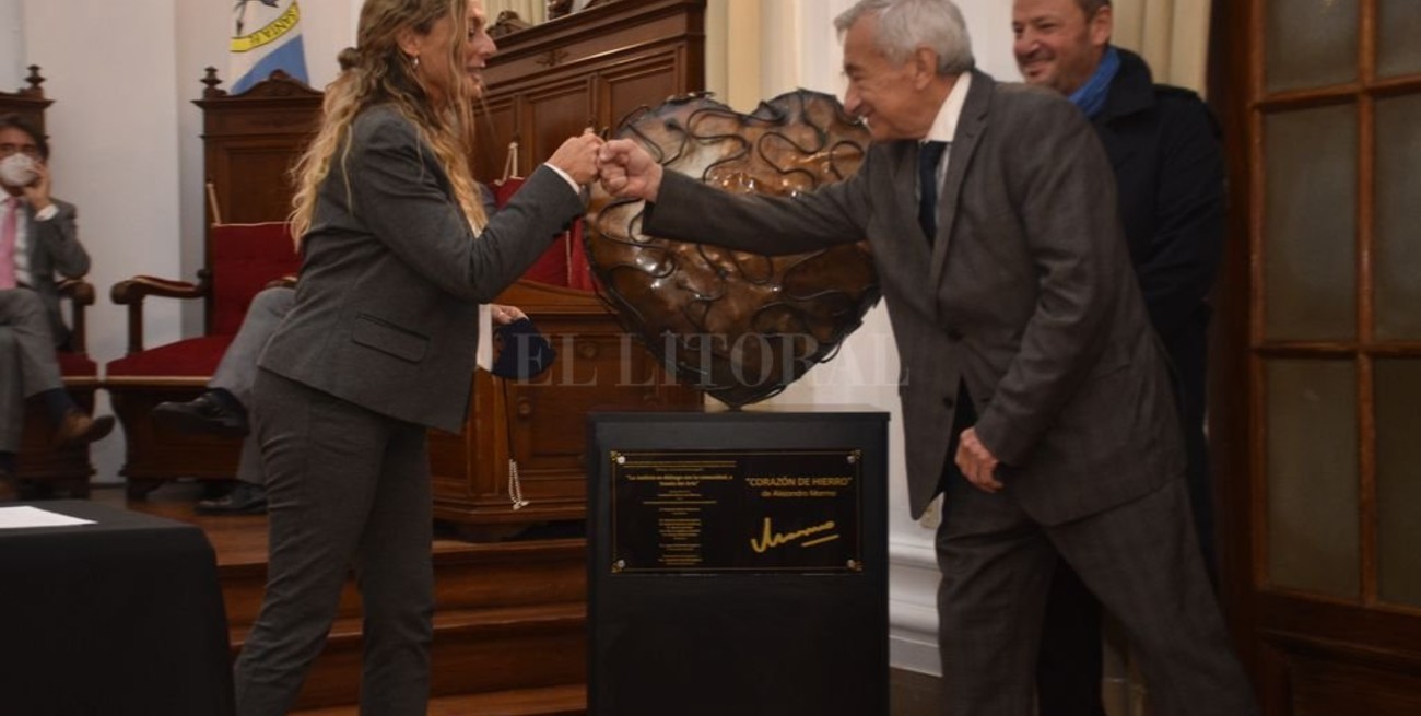 Flavio Raina La defensora Jaquelina Balangione, el presidente de la Corte Roberto Falistocco y el artista Alejandro Marno, junto a la obra, creada con rezagos industriales.Flavio Raina La defensora Jaquelina Balangione, el presidente de la Corte Roberto Falistocco y el artista Alejandro Marno, junto a la obra, creada con rezagos industriales.