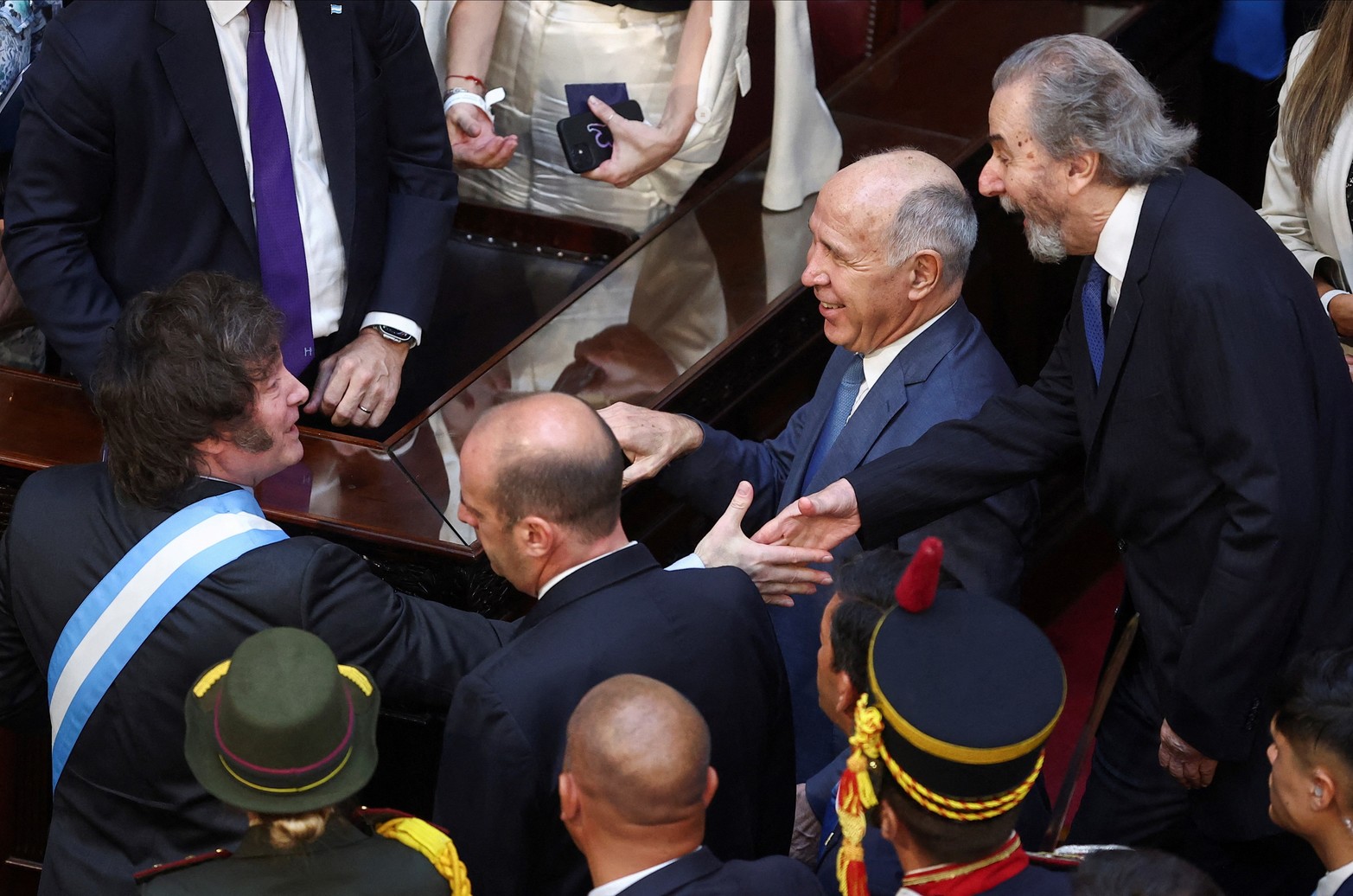5 / 17 El presidente Milei saluda a parte de los integrantes de la Corte Suprema de Justicia. Foto: Agustin Marcarian