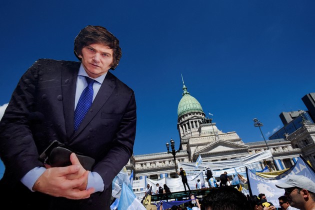Una gigantografía del presidente Javier Milei en el día de su ceremonia de asunción, frente al Congreso Nacional. Crédito: REUTERS / Martin Cossarini.