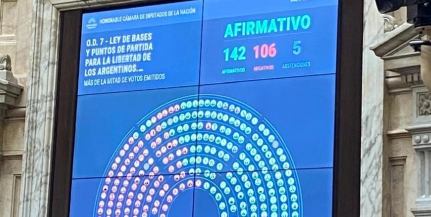 Luego de más de 20 horas de sesión, la Cámara de Diputados nacional votó en general el proyecto de Ley de Bases y Puntos de partida para la libertad de los argentinos que en su origen tenía más de 600 artículos y llegó al recinto con 223. Por 142 votos a favor, 106 en contra y 5 abstenciones, el proyecto de mayoría de la “ley ómnibus” obtuvo la media sanción en general e ingresó en el tratamiento en particular.