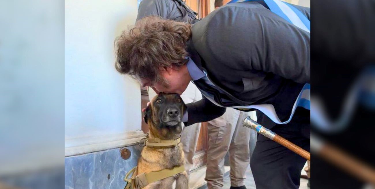 El presidente Javier Milei saludando afectuosamente a un can de la División Explosivos de la P.F.A. luego del acto por el Día de la Bandera en Rosario, Santa Fe, el pasado 20 de junio.