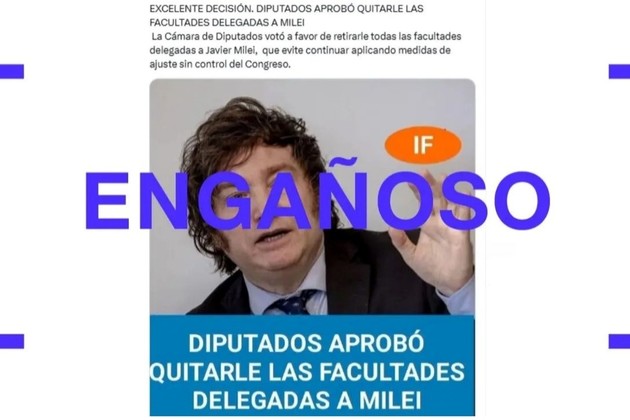 “DIPUTADOS APROBÓ QUITARLE LAS FACULTADES DELEGADAS A MILEI. En una sesión histórica, la Cámara de Diputados votó a favor de retirarle todas las facultades delegadas al presidente Javier Milei, lo que representa un duro revés político para el Ejecutivo nacional”, dice, entre otras afirmaciones, una publicación en Facebook.