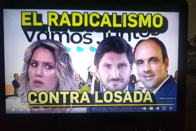 La propaganda se presenta como si fuera un informe periodístico y aparece sobre todo en Youtube. Se inicia con la imagen de la fotografía, que muestra un inventado enfrentamiento entre dos altos dirigentes radicales: Maximiliano Pullaro y José Corral y la candidata a senadora de ese espacio, Carolina Losada.