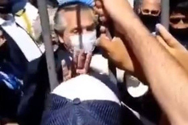 Con megáfono en mano, a los gritos y tras las rejas perimetrales, el Presidente se acercó a explicar que estaban organizando la reanudación de la entrada, algo que finalmente no sucedió y obligó tiempo después, incidentes mediante, a tener que cancelar la ceremonia.