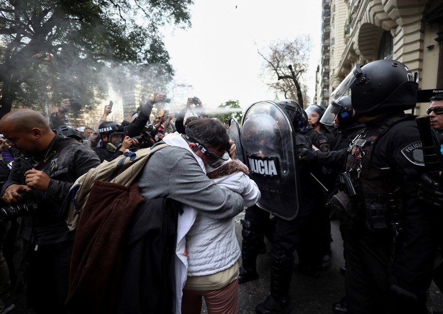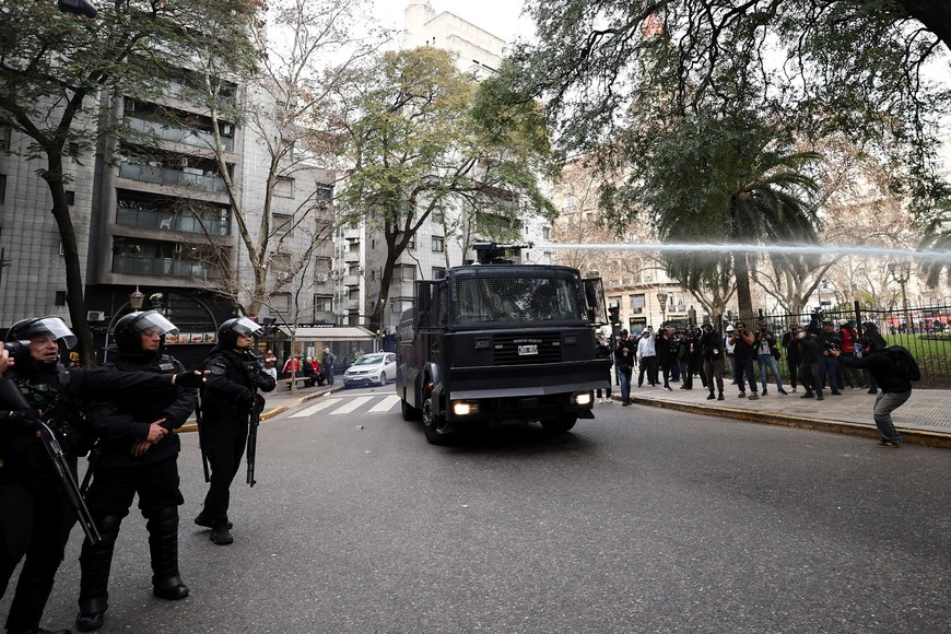 Mientras tanto, la policía aplicó un importante operativo en las inmediaciones, avanzando sobre los manifestantes y periodistas que cubren la protesta, haciéndolos retroceder con el uso de gas pimienta y carros hidrantes.