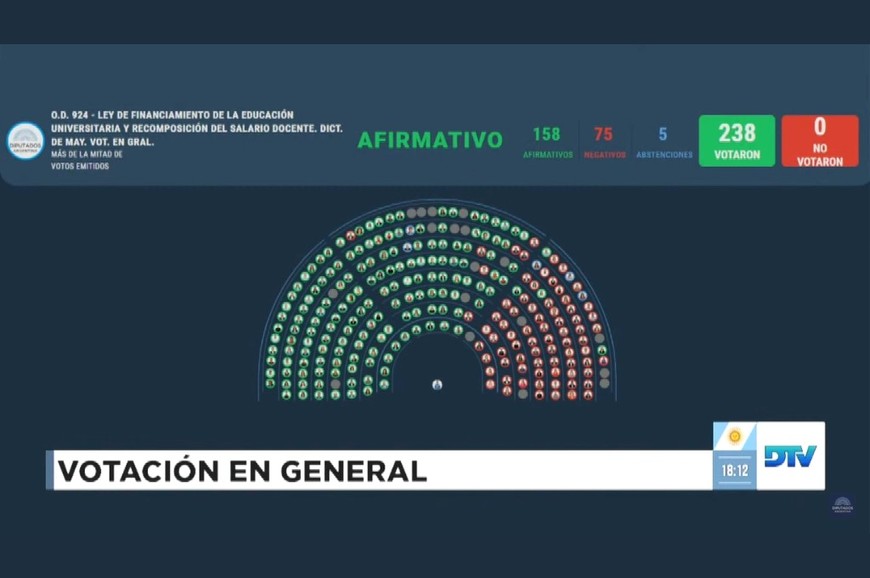 La Cámara de Diputados aprobó en general el proyecto de Ley de Financiamiento de la Educación Universitaria y Recomposición del Salario Docente. La votación resultó afirmativa por 158 positivos, 75 negativos y 5 abstenciones. Ahora se procede a la votación en particular.