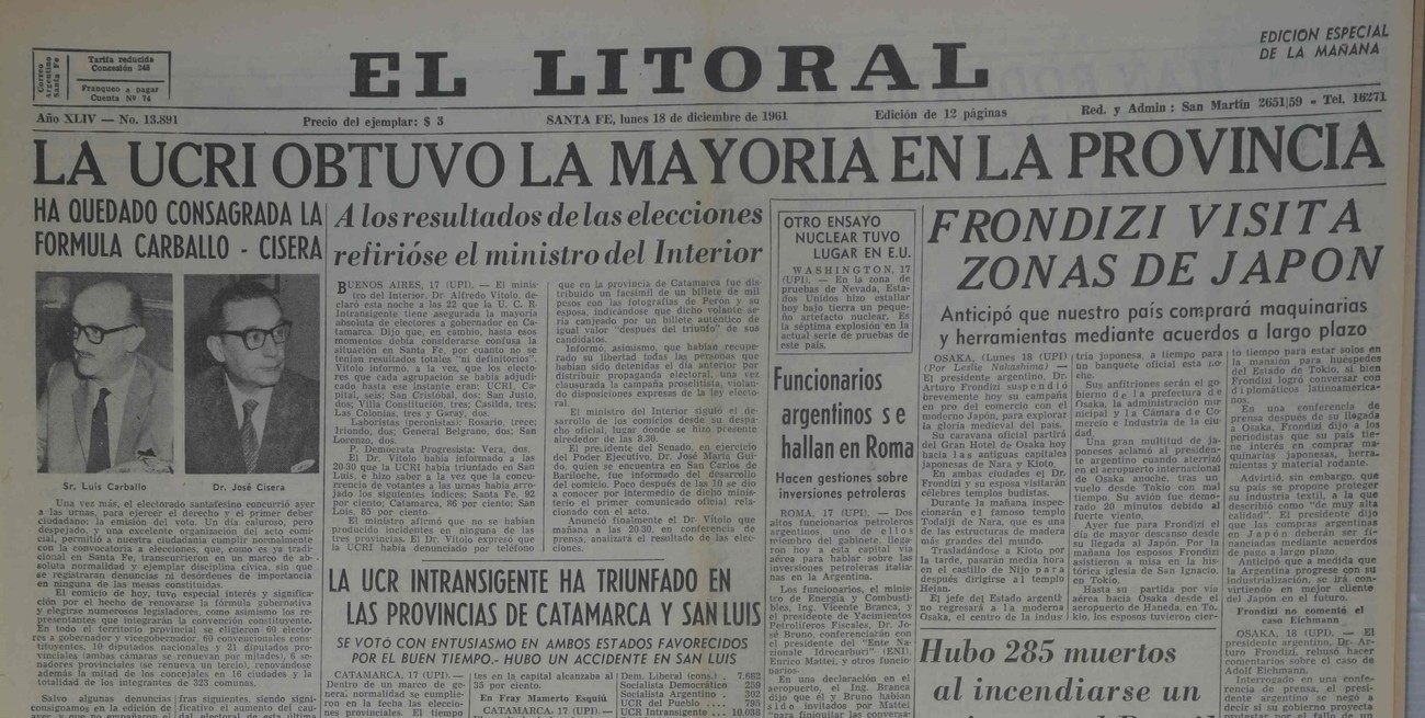 La crónica recuerda que Luis Cándido Carballo, de la oficialista Unión Cívica Radical Intransigente (UCRI), del presidente Arturo Frondizi y del gobernador saliente Carlos Sylvestre Begnis, obtuvo una estrecha victoria con el 30.63% contra el 24.80% de Jorge Tarrico, del neoperonista Partido Laborista.
