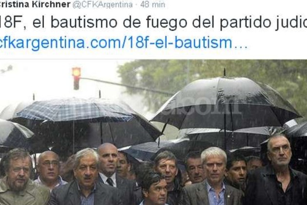 La presidenta Cristina Fernández publicó hoy en las redes sociales un análisis que realizó sobre la marcha del miércoles en homenaje al fiscal federal Alberto Nisman, fallecido cuatro días después de denunciarla por encubrimiento en la causa AMIA, y la señaló como "el bautismo de fuego del partido judicial".