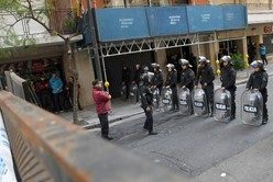 Un nuevo “vallado” de infantería recuperó la posición tras un intercambio entre militantes y efectivos policiales sobre calle Uruguay en la esquina con Guido.