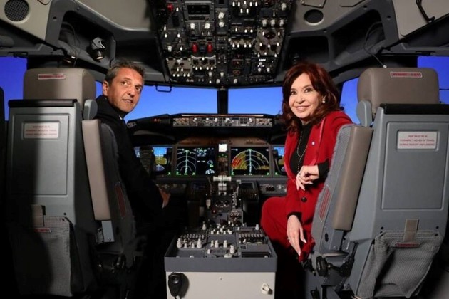 La vicepresidenta Cristina Fernández de Kirchner y el ministro de Economía y precandidato presidencial de Unión por la Patria (UxP) en las elecciones 2023, Sergio Massa, se reencontraron este lunes en un acto conjunto en Ezeiza por el 15° aniversario de la recuperación de la empresa estatal Aerolíneas Argentinas. Durante el acto presentaron un nuevo simulador de vuelo. También participó el presidente de Aerolíneas Argentinas, Pablo Ceriani.