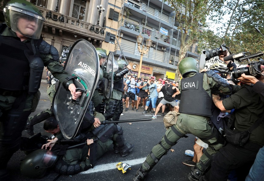En un intento de la Policía de la Ciudad de que los manifestantes se suban a la vereda una vez que llegaron a la Plaza Congreso, en el marco del protocolo antipiquetes de Patricia Bullrich, comenzaron las discusiones y forcejeos entre ambos. Hay empujones y corridas.