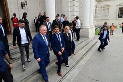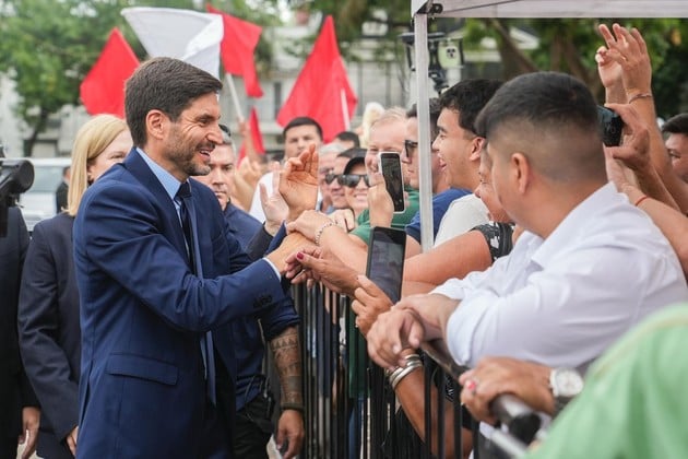 Simpatizantes y funcionarios radicales ocuparon la primera fila detrás de las vallas que separaron la Legislatura de la plaza y cuando llegó al lugar un grupo de docentes con pancartas, debieron conformarse con un segundo plano y competir en cánticos. Cuando llegó a la zona, Pullaro se bajó de la camioneta y directamente fue al encuentro de ellos y se detuvo a saludarlos durante un recorrido de más de cien metros. Después sí, el encuentro con las autoridades del Senado, que lo esperaban en la escalinata; aunque en esta ocasión sumaron a la presidenta de Diputados, Clara García.