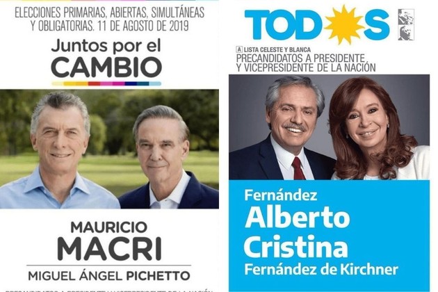 La boleta de Juntos por el Cambio muestra al precandidato presidencial Mauricio Macri y su compañero de fórmula Miguel Pichetto posando en los jardines de la Quinta de Olivos donde se tomaron la foto días atrás, mientras que la imagen de Alberto Fernández junto a Cristina Kirchner, el binomio del Frente de Todos, fue capturada en un espacio cerrado.