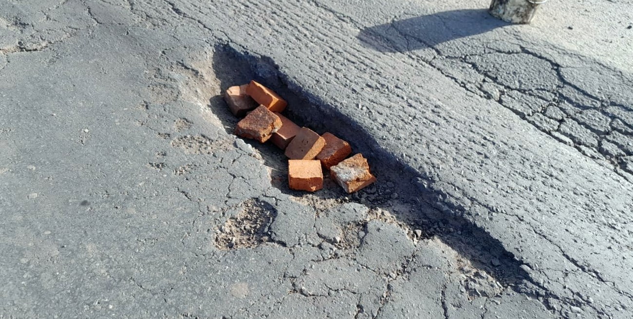 Vecinos colocan ladrillos para atemperar el efecto de los baches en la ruta. Una de las postales del deterioro.