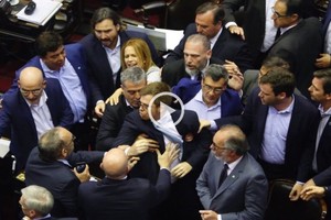 En ese marco de tensión, el macrista Nicolas Massot y el kirchnerista Daniel Filmus debieron ser separados en medio del tumulto que sucedía en el sector de bancas donde se sientan los legisladores oficialistas.