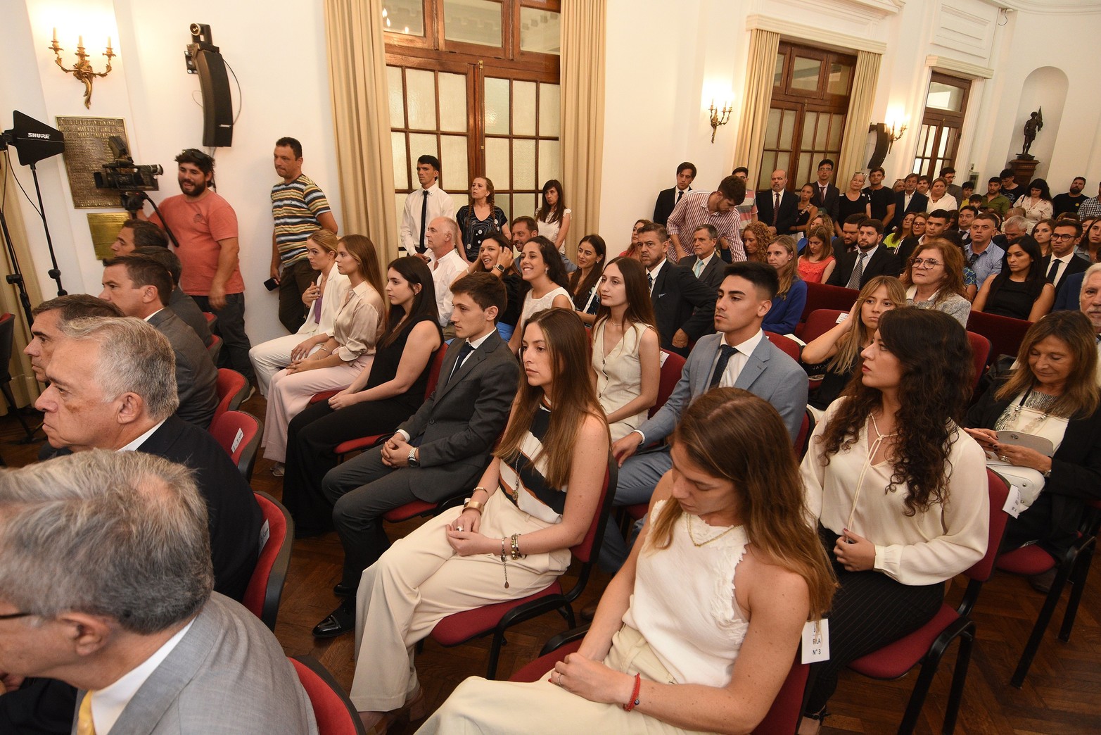 1 / 17 Distinguieron a los mejores promedios de las carreras de abogacía. El diploma y la medalla de honor fueron entregados por las autoridades del Poder Judicial y los representantes de las casas de estudios. Participaron el designado fiscal de Estado Domingo Rondina y el senador Julio Garibaldi. Foto: Guillermo Di Salvatore