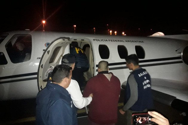 Fuentes policiales informaron que el principal imputado en el expediente arribó al aeropuerto de Ezeiza a las 20.45 procedente de Montevideo, en un avión de la Policía Federal en el que un grupo de efectivos fue especialmente a buscarlo.