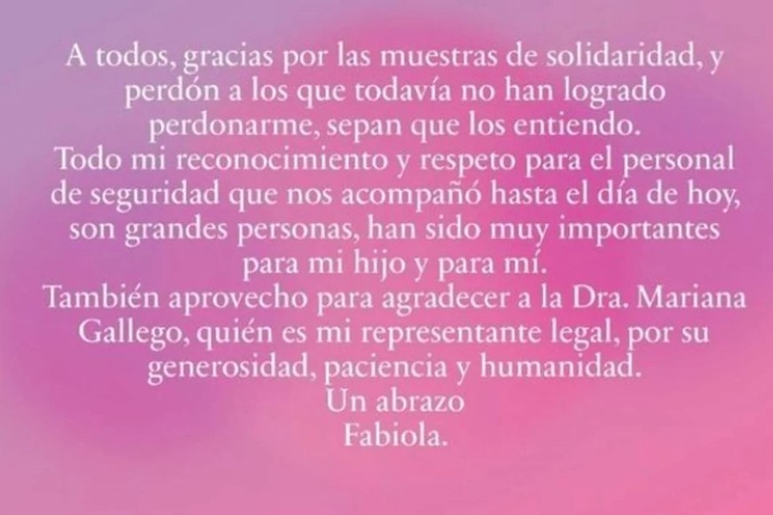 Más abajo, siguió: "Todo mi reconocimiento y respeto para el personal de seguridad que nos acompañó hasta el día de hoy, son grandes personas, han sido muy importantes para mi hijo y para mí".