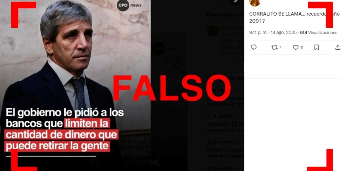 En ellos, se comparte una foto del ministro de Economía de la Nación, Luis Caputo (La Libertad Avanza), con el siguiente mensaje: “El Gobierno le pidió a los bancos que limiten la cantidad de dinero que puede retirar la gente”. En algunos posteos se agrega la frase “Corralito-Corralón”.