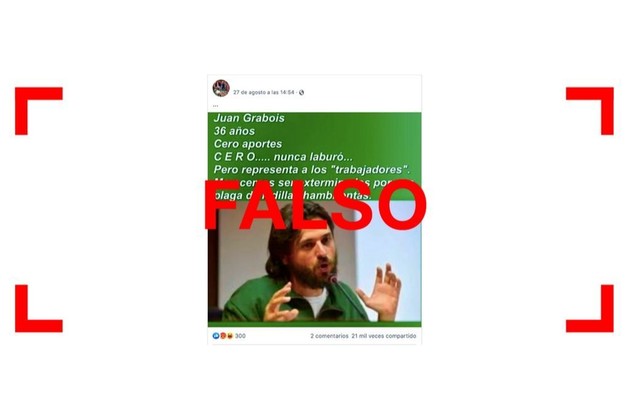 Circula en Facebook una imagen con la foto de Juan Grabois, dirigente del Movimiento de Trabajadores Excluidos (MTE), que incluye el siguiente texto: “Juan Grabois. 36 años. Cero aportes. C E R O…. nunca laburó….Pero representa a los ‘trabajadores’. Merecemos ser exterminados por una plaga de ladillas hambrientas” (sic). El posteo se compartió 21 mil veces en esa red social. Sin embargo, lo que indica es falso.