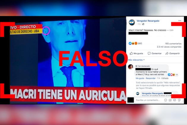 Durante el segundo debate presidencial, empezaron a circular en redes sociales distintas publicaciones que afirmaronn que el presidente de la Nación y candidato a la reelección por Juntos por el Cambio, Mauricio Macri, estaba participando en el debate con un audífono o auricular en la oreja derecha (ver acá y acá). Sin embargo, esto es falso: en los registros fotográficos del debate obtenidos por Reverso, se puede comprobar que el Jefe de Estado no tuvo ningún audífono o dispositivo similar en ninguna de sus orejas (ver acá y acá).