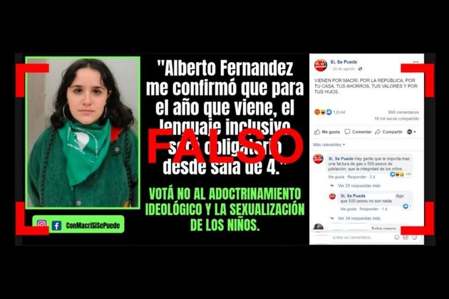 Circula por redes sociales un posteo con una supuesta frase de Ofelia Fernández, candidata a legisladora en la Ciudad de Buenos Aires por el Frente de Todos: “Alberto Fernandez me confirmó que para el año que viene, el lenguaje inclusivo será obligatorio desde sala de 4” (sic). La publicación está acompañada de una foto de la candidata y un texto que dice: “Votá no al adoctrinamiento ideológico y la sexualización de los chicos”.
