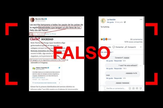 La imagen del tuit falso fue compartida junto a una captura de una nota del diario Clarín del domingo último que dice: “El apagón en la Argentina comenzó a las 7.06 y se extendió a Uruguay”. El creador de la desinformación (cuya identidad se desconoce) puso como horario de publicación del falso tuit de Macri las 7.05. de la mañana del mismo día, es decir, que el texto habría sido publicado un minuto antes de que se cortara la energía en el país.