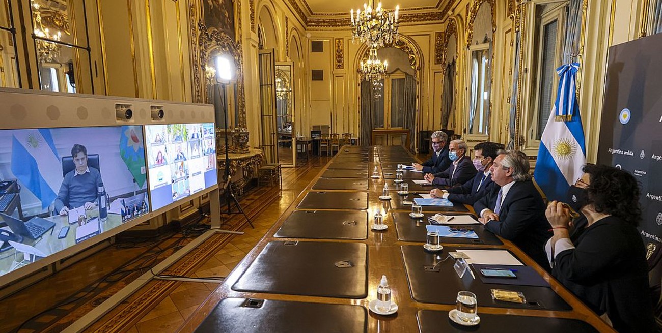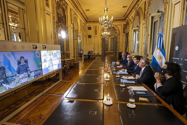 Durante la reunión virtual, el Presidente estuvo acompañado por el secretario General de la Presidencia, Julio Vitobello, y los ministros Eduardo de Pedro (Interior) y Carla Vizzotti (Salud).