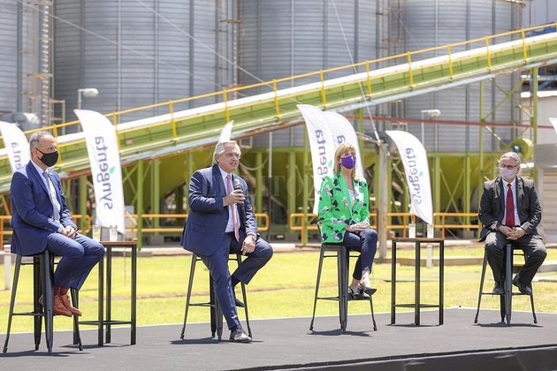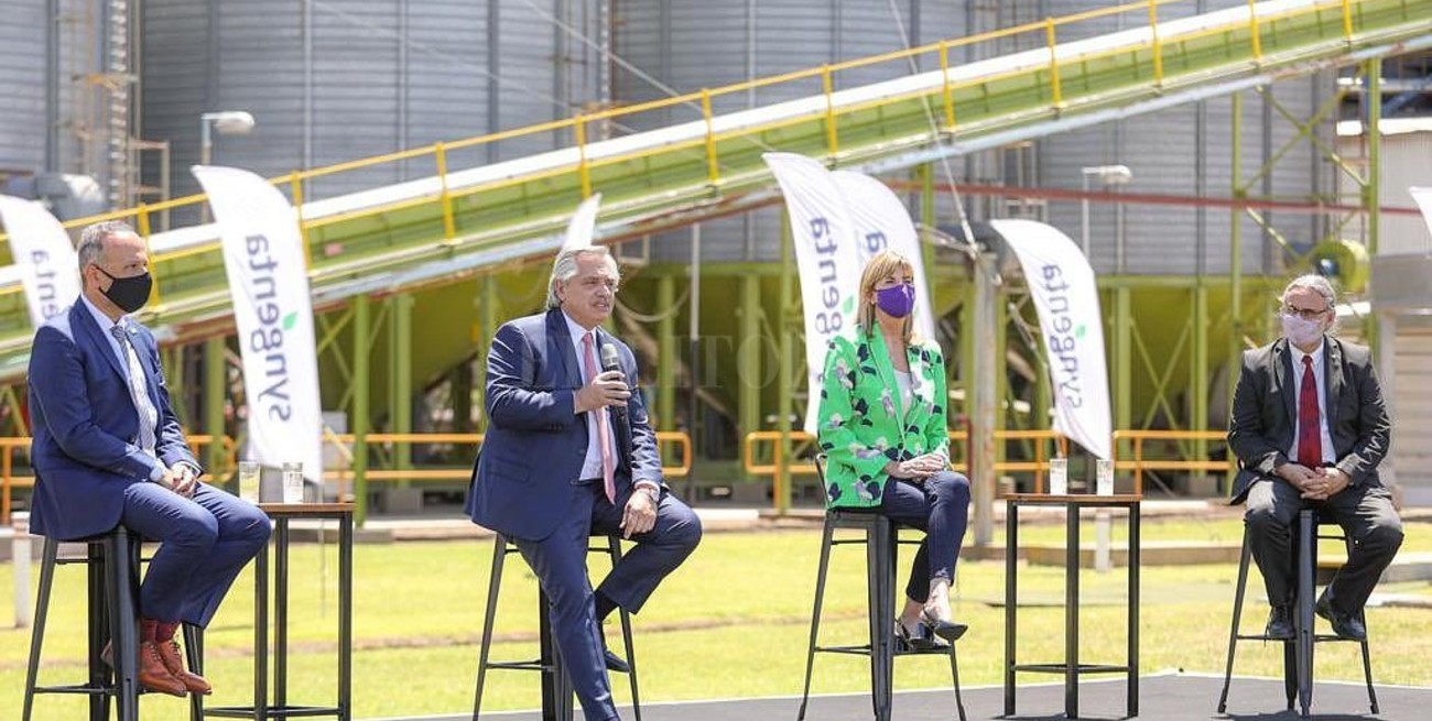 A las 13:30 Fernández se presentó a cielo abierto en el predio de Syngenta, a la vera de la Ruta 8, donde puso el eje de su discurso en los desafíos presentes y futuros del país. Afirmó que hoy fue un día singular, porque “estamos terminando el peor momento de la pandemia”, para luego agradecer el trabajo de los médicos en su día. Tras un aplauso cerrado de autoridades y funcionarios, habló de un “esfuerzo enorme de los profesionales de la salud”, a quienes entregó su gratitud.