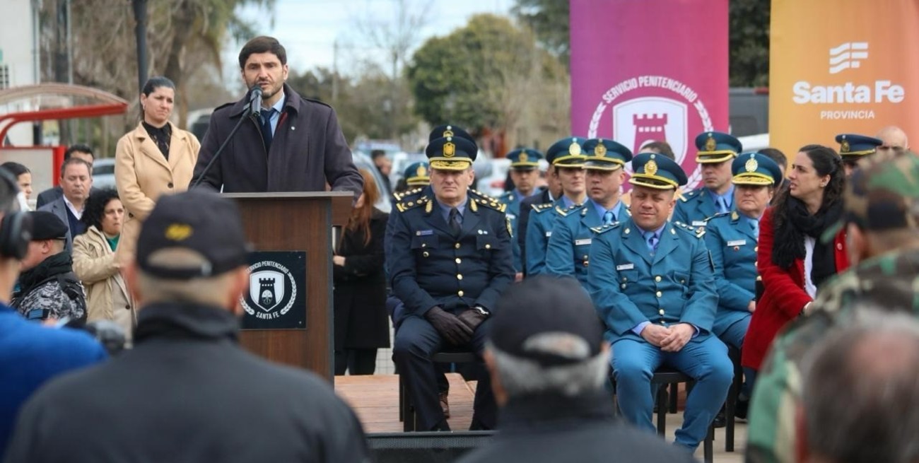 Pullaro no fue solo al acto, sino acompañado por la vicegobernadora Gisela Scaglia, la presidenta de la Cámara de Diputados, Clara García, además de varios ministros y autoridades del Servicio en una clara señal política hacia la institución.