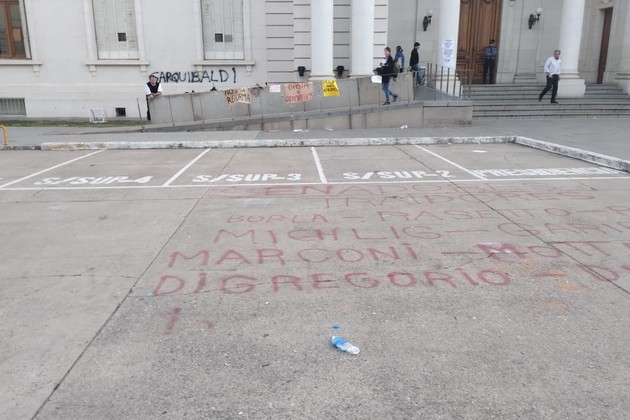 La nutrida manifestación de docentes y municipales de la Festram, que pacíficamente protestó contra los recortes en los beneficios para las jubilaciones en la provincia, tuvo una contracara cuanto menos agresiva, y desinformada. Con pintura negra se hizo una pintada sobre el frente del palacio de la Legislatura que deforma el apellido de un senador provincial al mezclarlo con la palabra "garca". Se trata en rigor de solo uno de los 14 legisladores que se expresaron por la afirmativa.