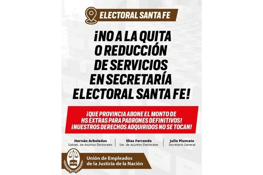 Cuando el juez federal con competencia electoral, Reinaldo Rodríguez, aludió públicamente a la controversia generada con Daniel Erbetta, aseguró que la suma exigida – 55 millones de pesos- no era "discrecional" ni "una avivada". Explicó, en cambio, que la cifra surgía de una fórmula actualizada según el índice de inflación, y que el dinero era necesario para pagar las horas extras del personal que debía trabajar en la confección y actualización de los padrones. La situación motivó, de hecho, una incipiente protesta del personal. "¡No a la quita o reducción de servicios en Secretaría Electoral Santa Fe! ¡Que provincia abone el monto de horas extras para padrones definitivos! ¡Nuestros derechos no se tocan!", planteaba una suerte de panfleto virtual que se difundió a través de redes sociales.