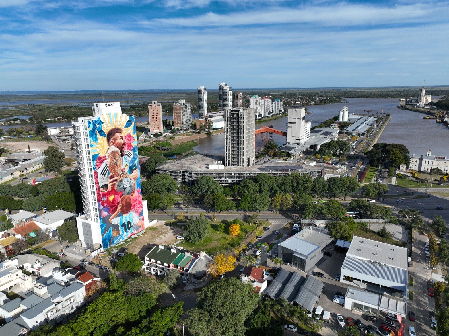 7 / 8 Obra finalizada. El mural que comenzó en marzo de 2023 llegó a su fin esta semana. La obra de “Niño de cobre” sobre Lionel Messi tiene 2300 metros cuadrados: 75 metros de altura y 40 metros en la parte más ancha. Se utilizaron 600 litros de pintura (30 latas de 20 litros) para la base y unos 1000 aerosoles. Foto: Fernando Nicola