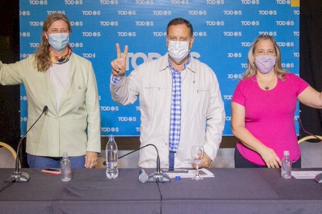 El gobernador, Ricardo Quintela y Gabriela Pedrali, encabezaron en conferencia de prensa el anuncio del triunfo del Frente de Todos en la capital riojana junto a Ricardo Herrera candidato en segundo lugar, y la suplente Claudia Allegri, ya que el intendente Jorge Salomón, el otro suplente, se encontraba en su Departamento, General Ocampo.