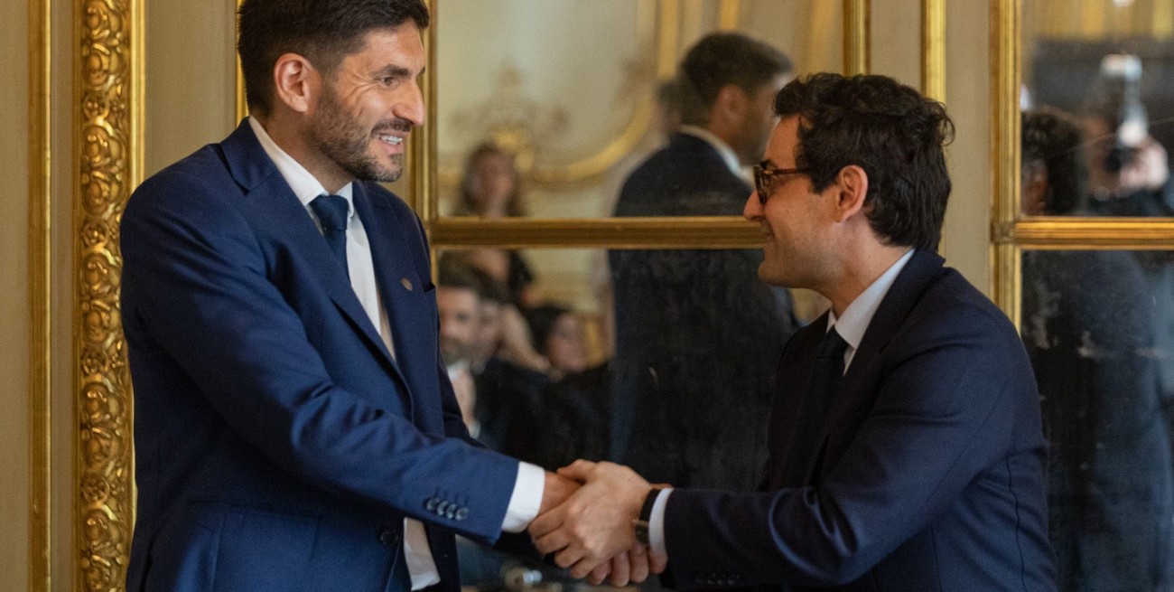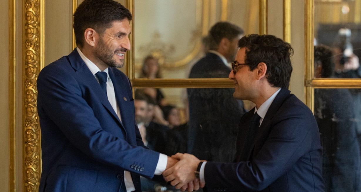 El ministro de Relaciones Exteriores de Francia, Stéphane Sejourné, mano a mano con el gobernador de Santa Fe, Maximiliano Pullaro. Foto: Gentileza