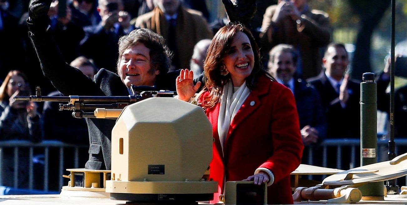 El Presidente de Argentina, Javier Milei, y la Vicepresidenta Victoria Villarruel, salen de un vehículo militar durante un desfile militar que conmemora el 208º aniversario de la independencia del país de España en 1816, en Buenos Aires, Argentina, el 9 de julio de 2024. REUTERS