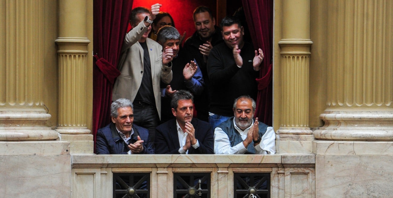 En los palcos estuvo Massa junto a los líderes de la CGT, Héctor Daer, Pablo Moyano y Carlos Acuña, con quienes se abrazó tras la votación. Crédito: NA