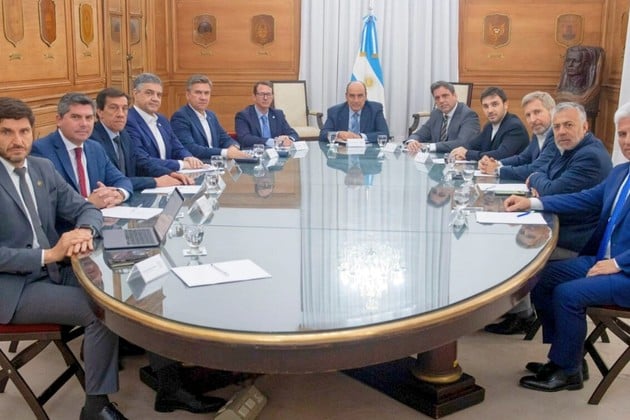 El jefe de Gabinete Guillermo Francos, junto al vicejefe de Gabinete del Interior, Lisandro Catalán, y el secretario de Hacienda, Carlos Guberman, recibieron este mediodía a nueve de los diez los gobernadores que integran el espacio de Juntos por el Cambio.