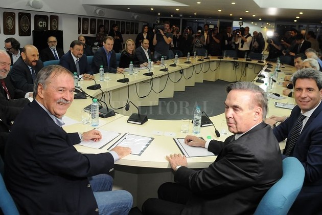 El mitín estuvo encabezado por Juan Schiaretti (Córdoba), Sergio Uñac (San Juan) y Juan Manzur (Tucumán), a quienes se sumó el elegido por los mandatarios como "articulador" del peronismo e interlocutor con la Casa Rosada: Miguel Pichetto, jefe del bloque de senadores del PJ-FpV.