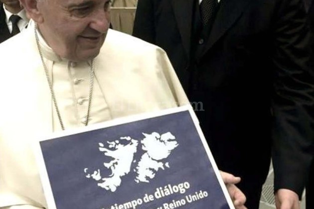 Su Santidad sostuvo en público un cartel que reclama diálogo sobre la soberanía de las islas.