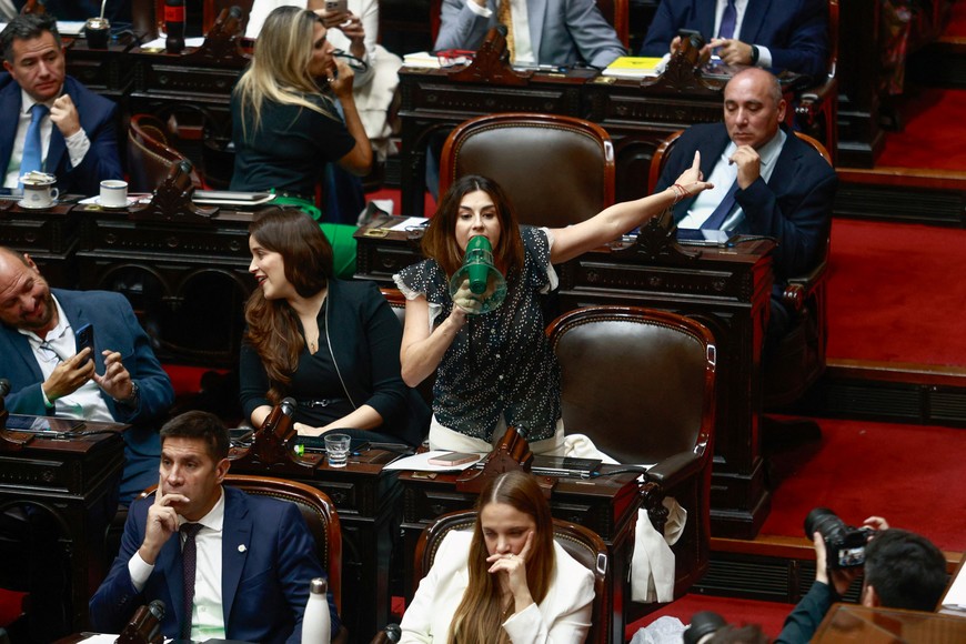 La legisladora Marcela Pagano usa un megáfono en medio de la sesión. Créditos: Reuters