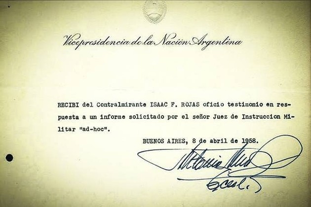 Con membrete de “Vicepresidencia de la Nación”, el 4 de septiembre 1957, Rojas responde al juez de Instrucción Militar ad-hoc, teniente coronel Antonio del Rivero, que la ley marcial fue ordenada por él y que estimaba que había sido entre las 23 y las 23.20. No conforme con esto, el 7 de abril, el juez volvió a pedirle detalles sobre el tema: “Por qué medios y en qué momento se hizo público el texto de los decretos 10362 y 10363”, consultó el juez. Un día después, Rojas contestó: ““Mi específica actividad militar en la emergencia, no me permite afirmar con absoluta fidelidad la hora exacta en que impartí la orden, ni recordar a todas las personas a través de las cuales se ordenó”.