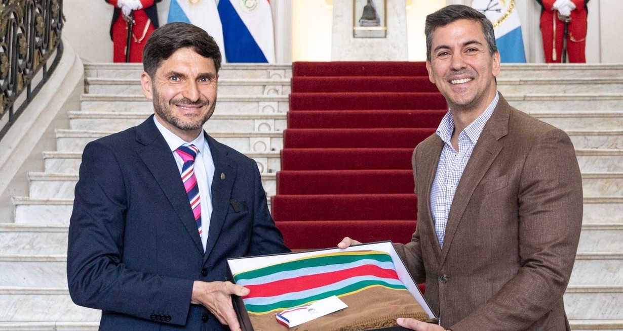 Maximiliano Pullaor, gobernador de la provincia de Santa Fe, junto a Santiago Peña, presidente de Paraguay.