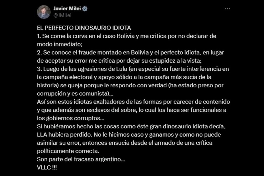 Iniciando con la definición de “El perfecto dinosaurio idiota”, Milei enumera una serie de situaciones en la que este enigmático personaje caería: “Se come la curva en el caso Bolivia y me critica por no declarar de modo inmediato”, inicia el texto.