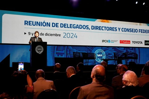 Javier Milei participó del evento “Delegados, Directores y Consejo Federal de la Sociedad Rural”. Crédito: NA