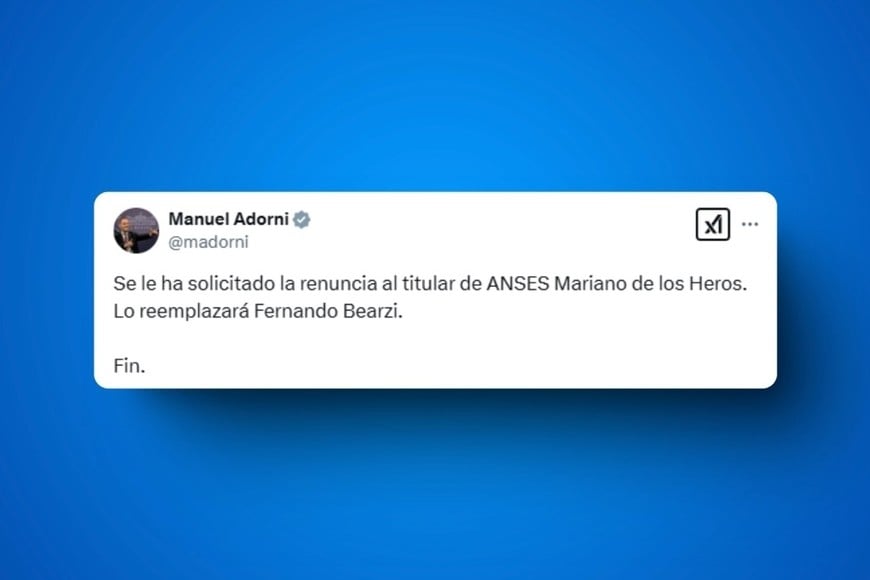 Pocas horas después, el vocero presidencial Manuel Adorni oficializó la salida de De los Heros a través de su cuenta en X: "Se le ha solicitado la renuncia al titular de ANSES Mariano de los Heros. Lo reemplazará Fernando Bearzi".