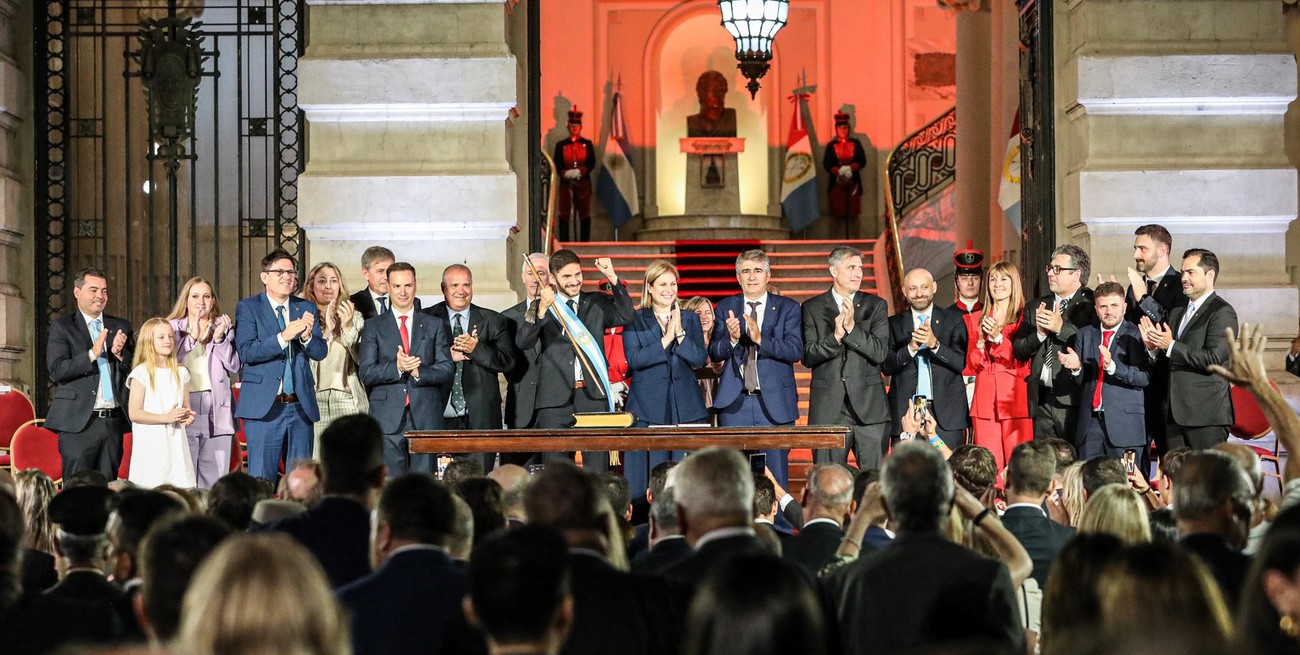 Minutos antes había recibido los atributos en el Salón Blanco de Casa de Gobierno, de manos del mandatario saliente, Omar Perotti. El propio Perotti recibió a su vez, y según la costumbre, una réplica del bastón y también la banda que utilizó durante su gestión.